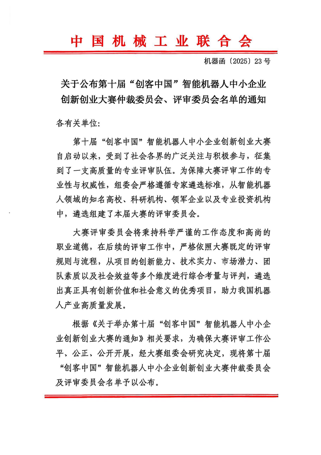 关于公布第十届“创客中国”智能机器人中小企业创新创业大赛仲裁委员会、评审委员会名单的通知