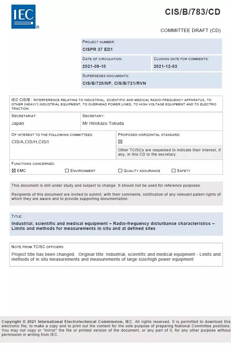 IEC/CISPR/B CISPR 37进入CD阶段