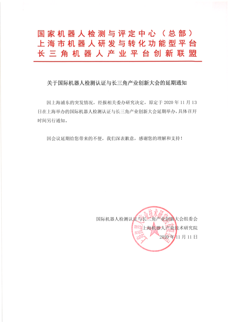 关于国际机器人检测认证与长三角产业创新大会的延期通知