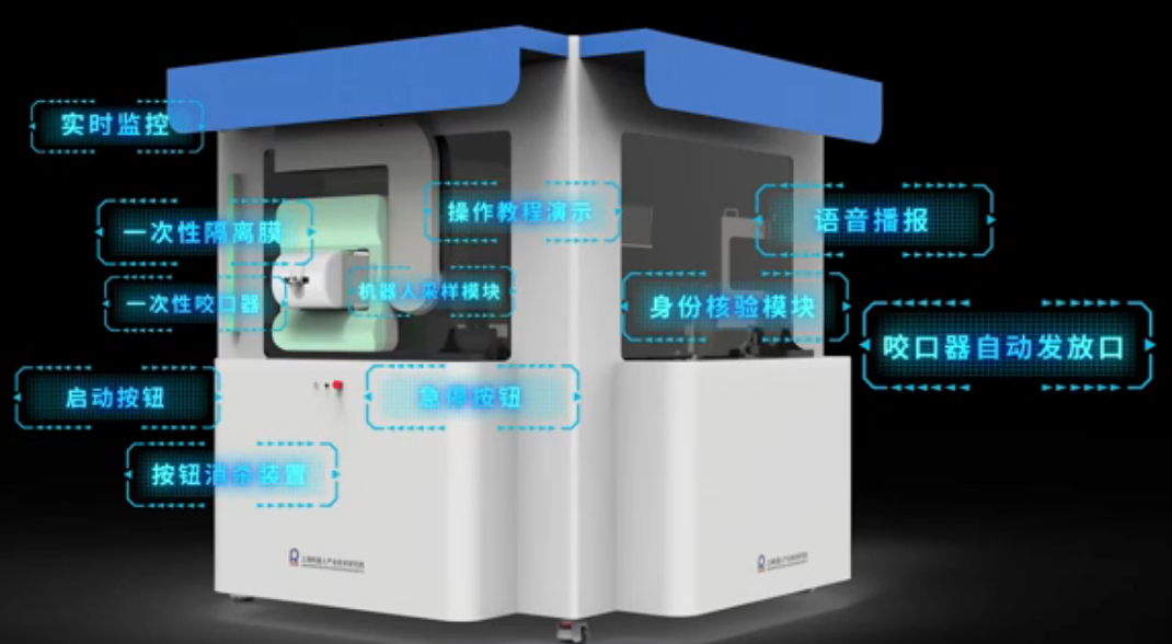 ●检测者可自主完成采样:检测者扫描检测码后,放置并佩戴一次性咬口器,按下开始按钮,便可启动机器人开始采样操作。整个过程操作简单,无需辅助,可实现被测人员自主完成采样全过程。